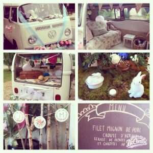 Autre idée sympa glissée par les futurs mariés : transformer le Combi en photo booth une fois arrivé sur le lieu de la réception. Pour cela, rien de plus simple : une grande banquette bien adaptée pour accueillir 3/4 personnes, quelques masques, postiches et autres moustaches pour le fun, de la bonne musique pour l’ambiance et enfin un Polaroid pour capturer ces moments de complicité et de franche rigolade.