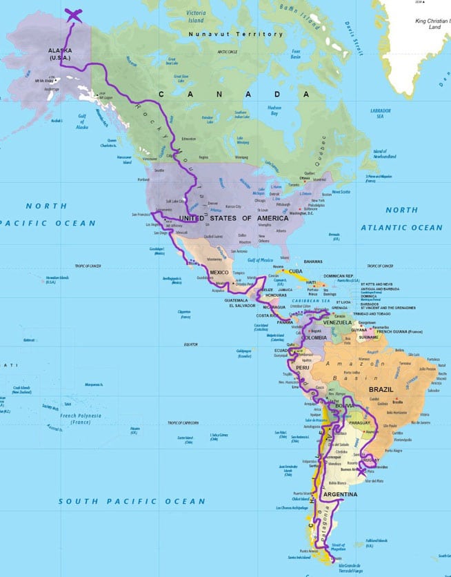 Ce roadtrip a duré finalement 4 années et demie et l’a fait passer par quasiment tous les pays du continent américain, de la Patagonie et la Terre de Feu jusqu’au Nord de l’Alaska, au bord de l’Océan Arctique.