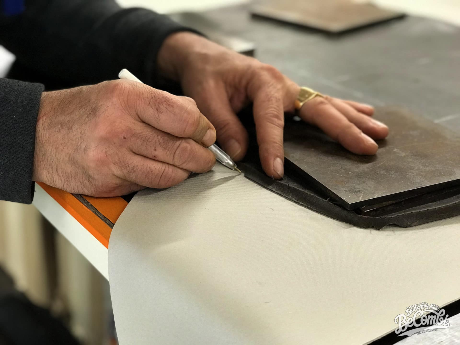 Pour bien commencer le boulot, il faut tout d’abord déterminer le besoin, les couleurs, les textures… Par chance, Patrick est un passionné du milieu Combi VW (possesseur d’un T3 de 1982 et d’un T2a qu’il a entièrement refait au Canada, son premier Combi fût un Split 21 fenêtres !), il connait donc bien les différentes techniques pour les sièges de Combi ou encore les panneaux de portes ! Nous partirons sur un design à l’ancienne (une seule bande sur toute la longueur intérieure), avec des textures de simili-cuir et de tissu, dans des tons un peu plus actuels. En effet, Tchouk n’est pas un show-car (surtout en l’état actuel !), mais un T3 pour voyager, partir loin et vivre en confort. Les couleurs choisies sont donc de tons assez clairs, un simili-cuir couleur macadamia et un tissu au touché velours « taupe » (plus proche d’un gris sombre avec sa trame fine et croisée de couleur noire). En terme de quantité, autant ne pas lésiner, nous avons passé plus de 9 mètres linéaires de simili-cuir et 6 mètres de tissus !